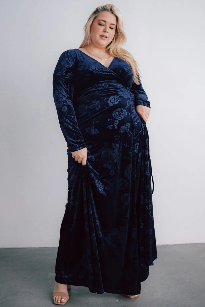 - Stunning navy colored velvet material with subtle rose floral embossed design