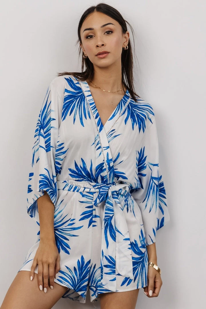 FT Banyan Kimono Romper | White + Blue Palm Print Boho
