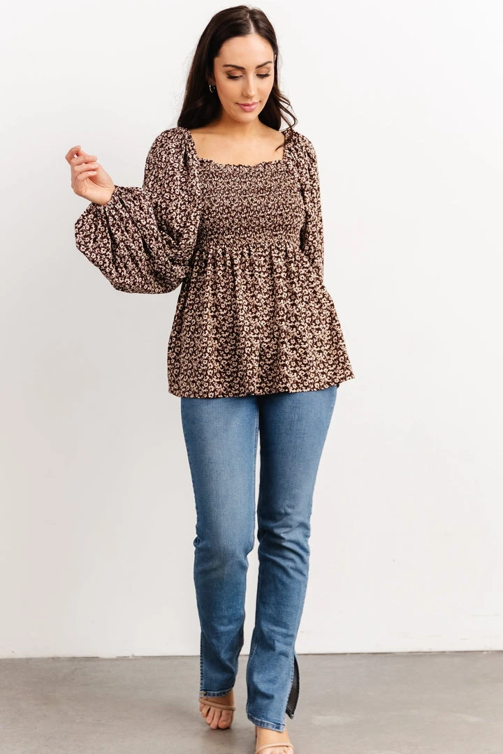HAY Greta Long Sleeve Peasant Top | Brown Floral